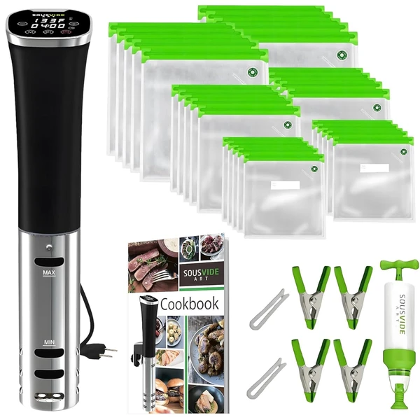 SOUSVIDE ART Sous Vide Precision Cooker Kit - 800W Immersion Circulator with Timer and Temperature Control - Includes 30 Vacuum Bags, Pump, and Cookbook for Home Cooking