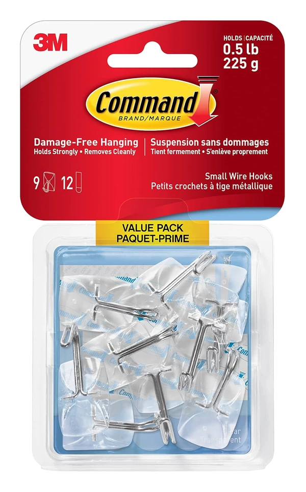 Command Wire Hooks Value Pack, Small, Clear, 9 Hooks 12 Small Strips
