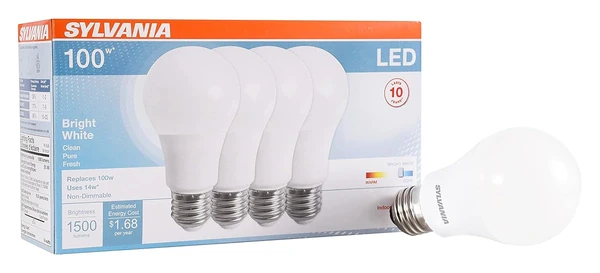 Sylvania Home Lighting 78102 Sylvania, 100W Equivalent, Led Light Bulb, A19 Lamp, 4 Pack, Efficient 14W, Bright White 3500K